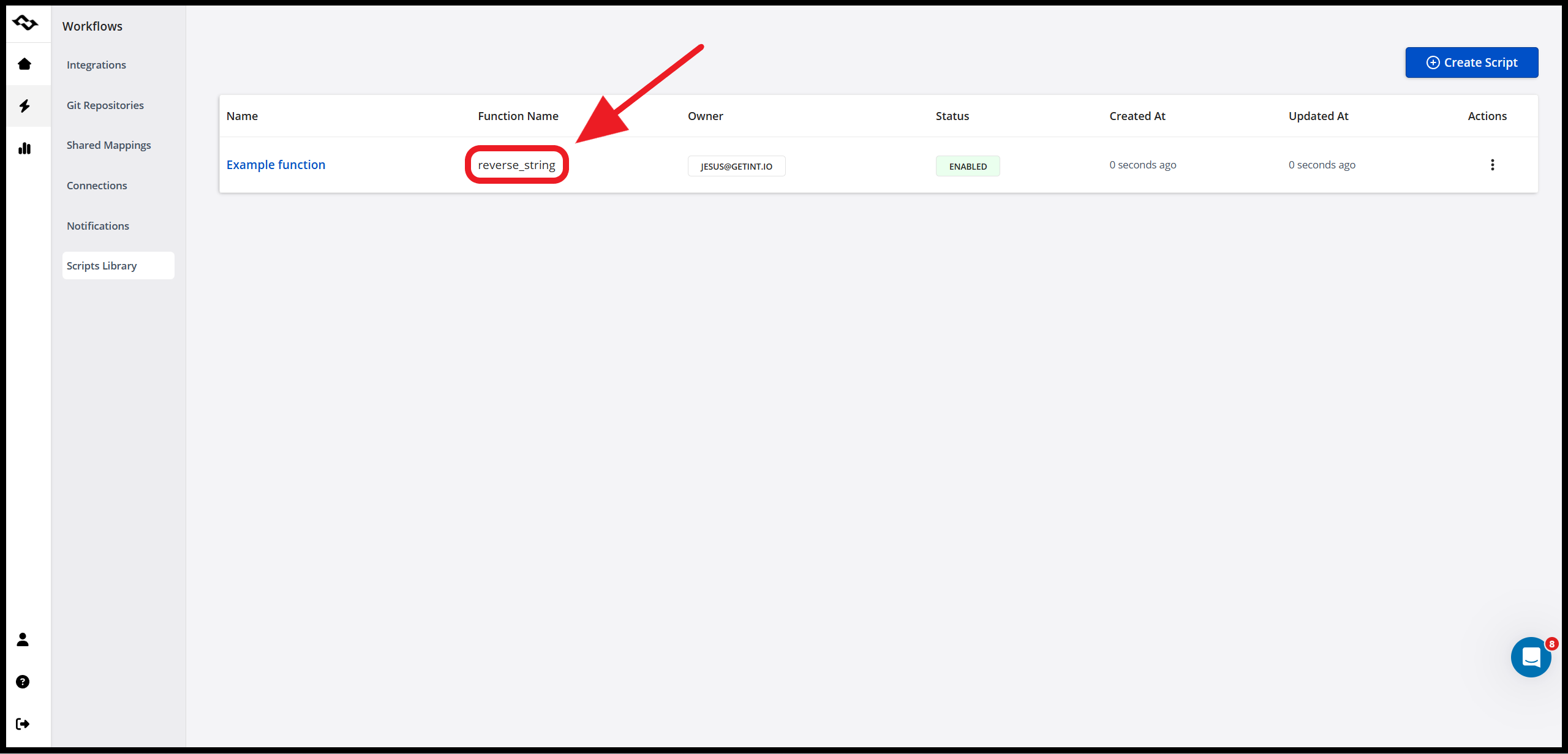 * **Save and verify**: After saving the script, check the list of scripts. You should see your function name displayed in the second column, which helps confirm that it's distinct and properly registered.