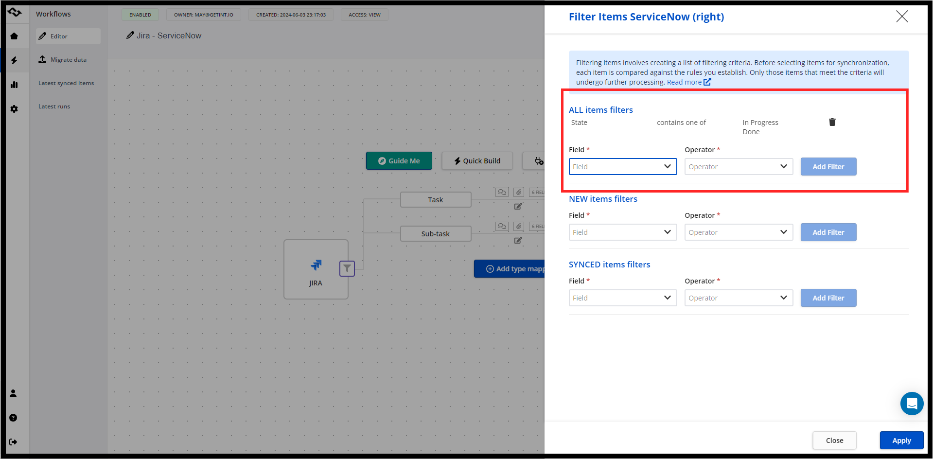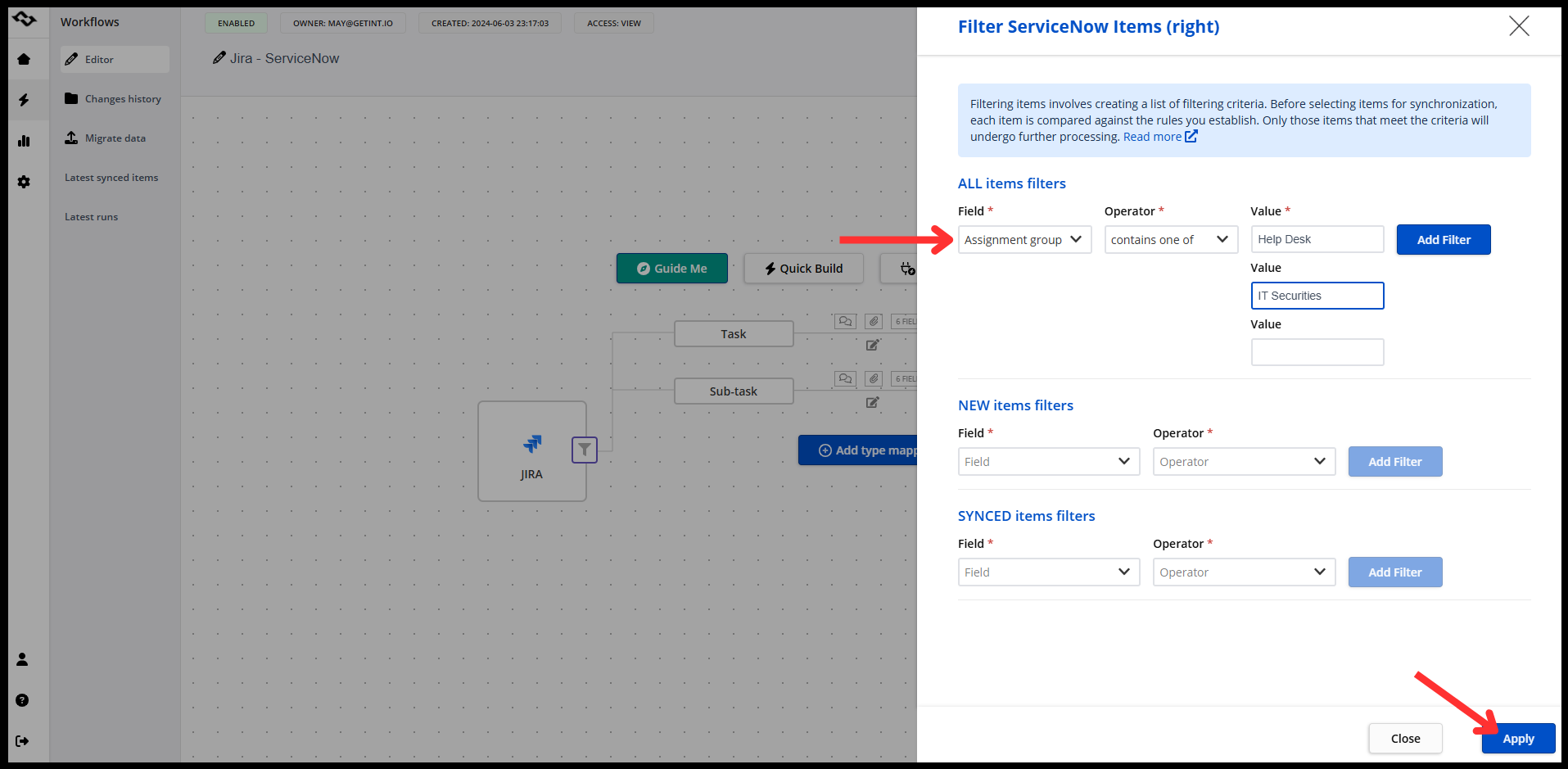 Efficient issue management requires precise control over the flow of information between integrated systems. Filtering by assignment group and status allows you to streamline this process, ensuring that only the necessary issues are synchronized according to your workflow needs. In this guide, we will focus on configuring these filters within your Getint integration, using a common use case: filtering by assignment group and status for ServiceNow, particularly in the context of a Jira-ServiceNow integration.