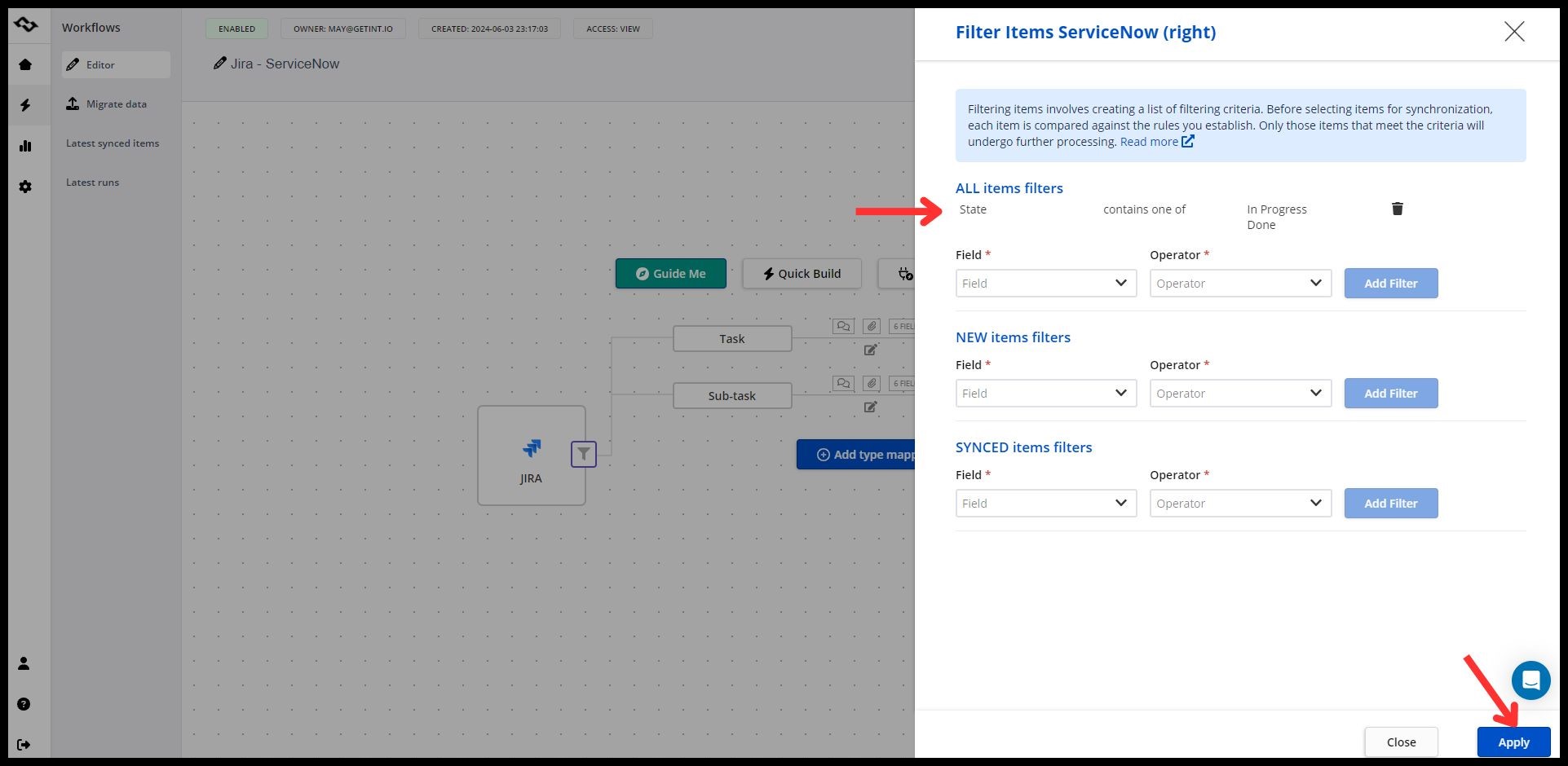 * Once you have configured your filters, click "Save" to apply them to your integration.