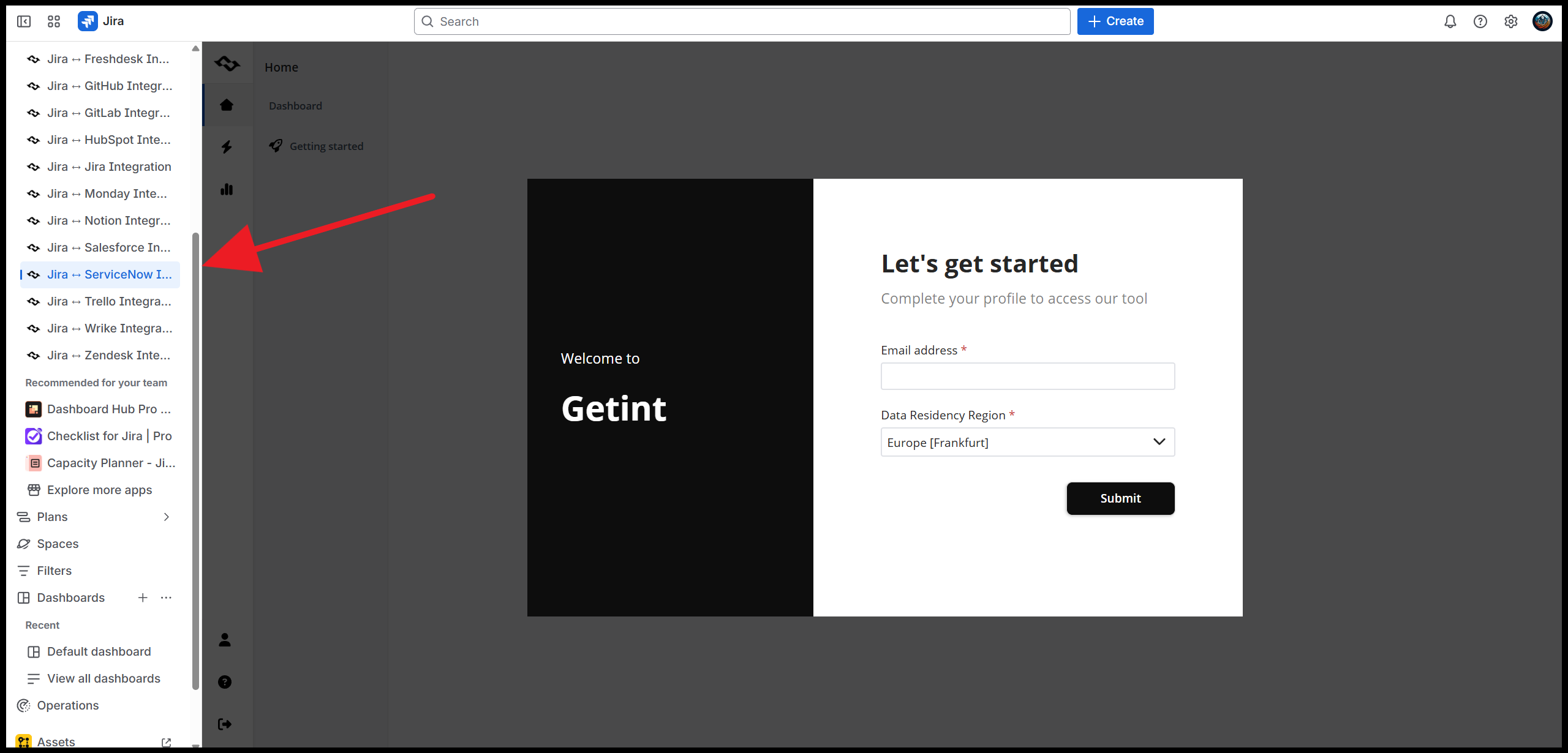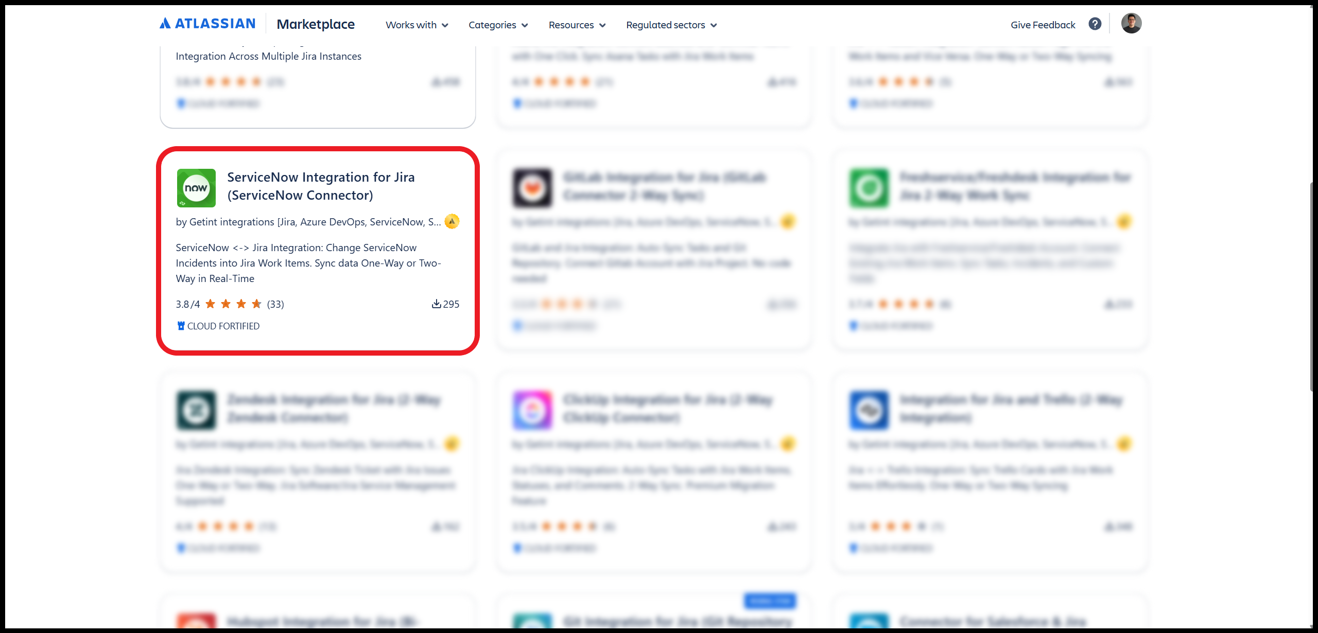 3. If you don’t have an active trial, go to the Atlassian Marketplace and search for **Getint**. All our apps will be listed there. Select the app you need for your integration (in this example, we’ll use ServiceNow).