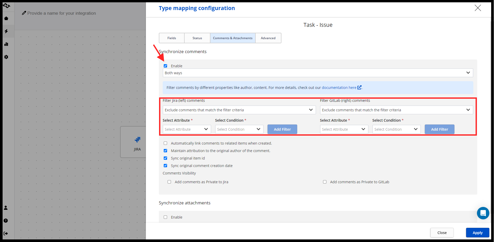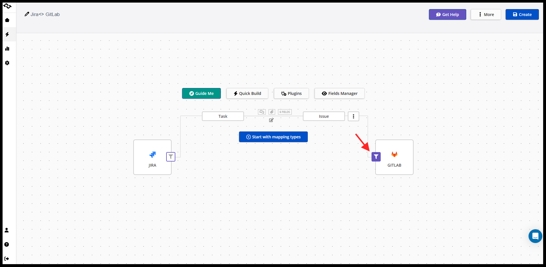 * Click on the filtering icon near the app icon in your integration. This will apply to that side of the integration.