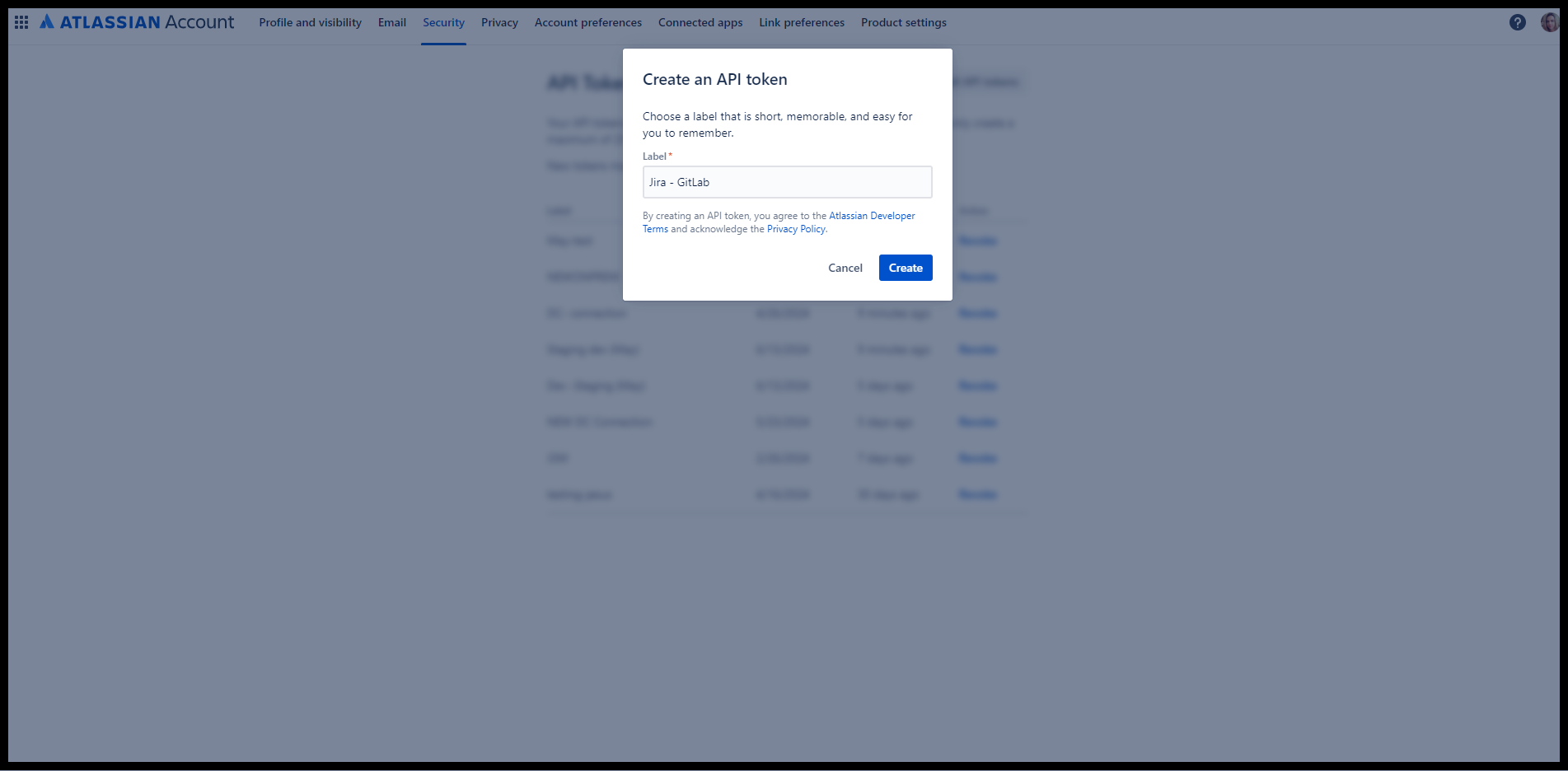 * Navigate to Security and generate an API token, then use this token as the password for Jira integration.