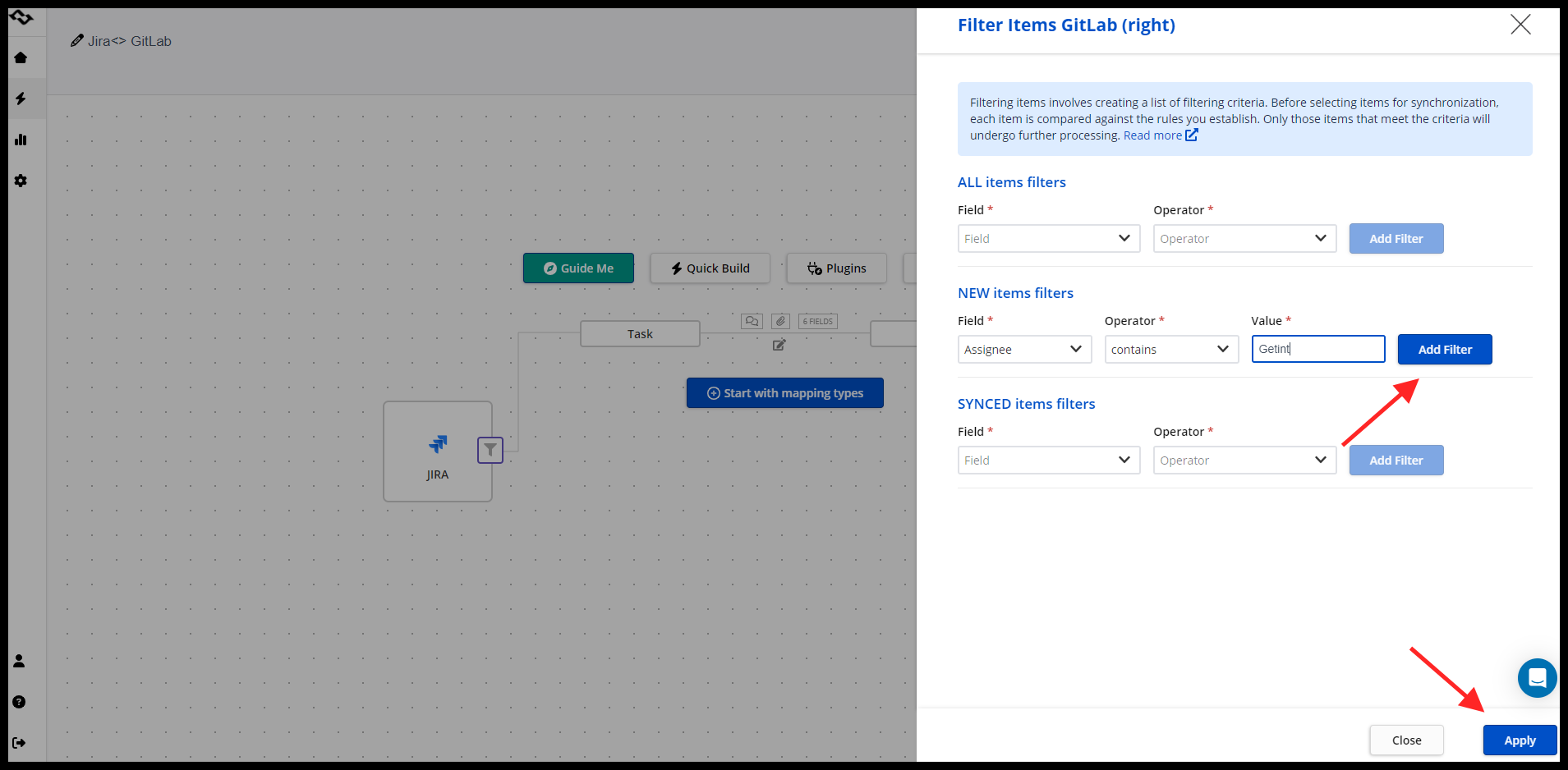 * Note that if the option “*New items”* is selected, the filtering will apply only to the new items, and the already synced items will continue to sync and update. If the option “*Synced items”* is selected, only the already synced items will be updated based on that filter.