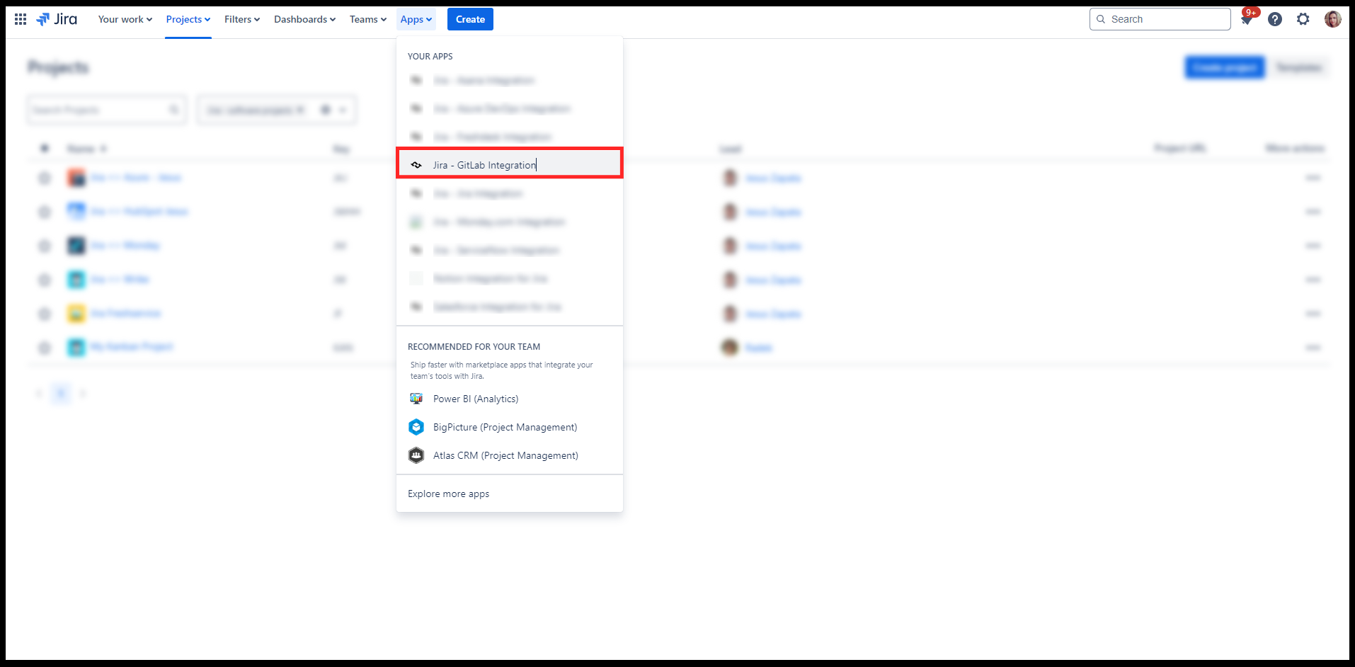 * Navigate to "Apps" and select “Jira - GitLab Integration”