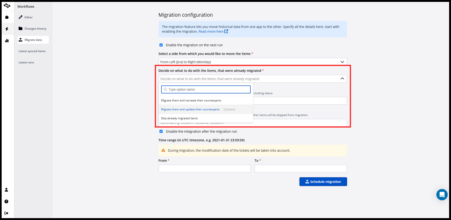 <figure><img src="https://4106311246-files.gitbook.io/~/files/v0/b/gitbook-x-prod.appspot.com/o/spaces%2F-MR6Z9V8zLATPQPOGSDf%2Fuploads%2FNAnR84uL4PvL0jFwrj2S%2Fenable%20migration%20on%20the%20next%20run%20Jira%20Monday.png?alt=media&#x26;token=45656f80-b99c-481e-8961-0aaceecc785e" alt=""><figcaption></figcaption></figure>