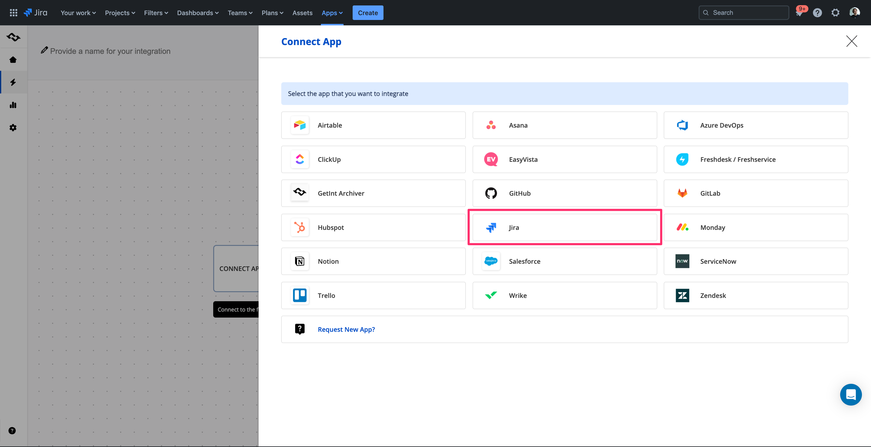 * Select **Connect App**, choose Jira, and click **Create New Connection**.
