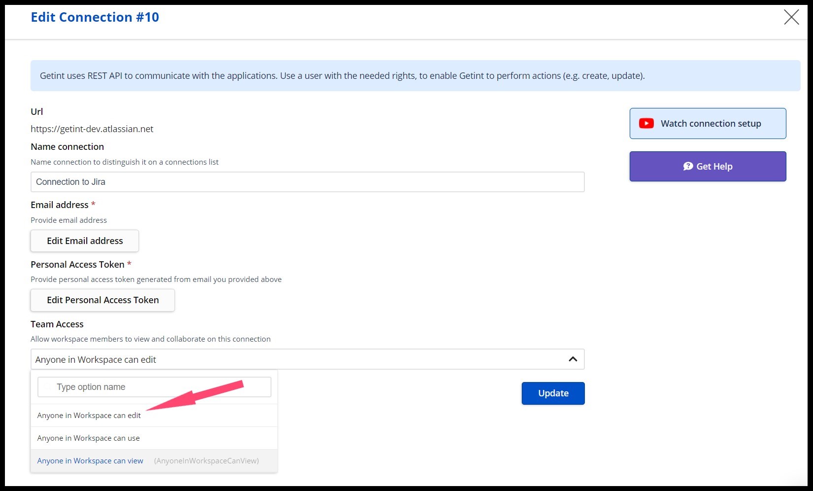 There are several ways to grant access to Getint if you need assistance from our team. [Here](https://docs.getint.io/getintio-platform/settings/sharing-access-permission), you'll find a detailed guide on how to share access permissions and allow our support team to address any issues you may experience.
