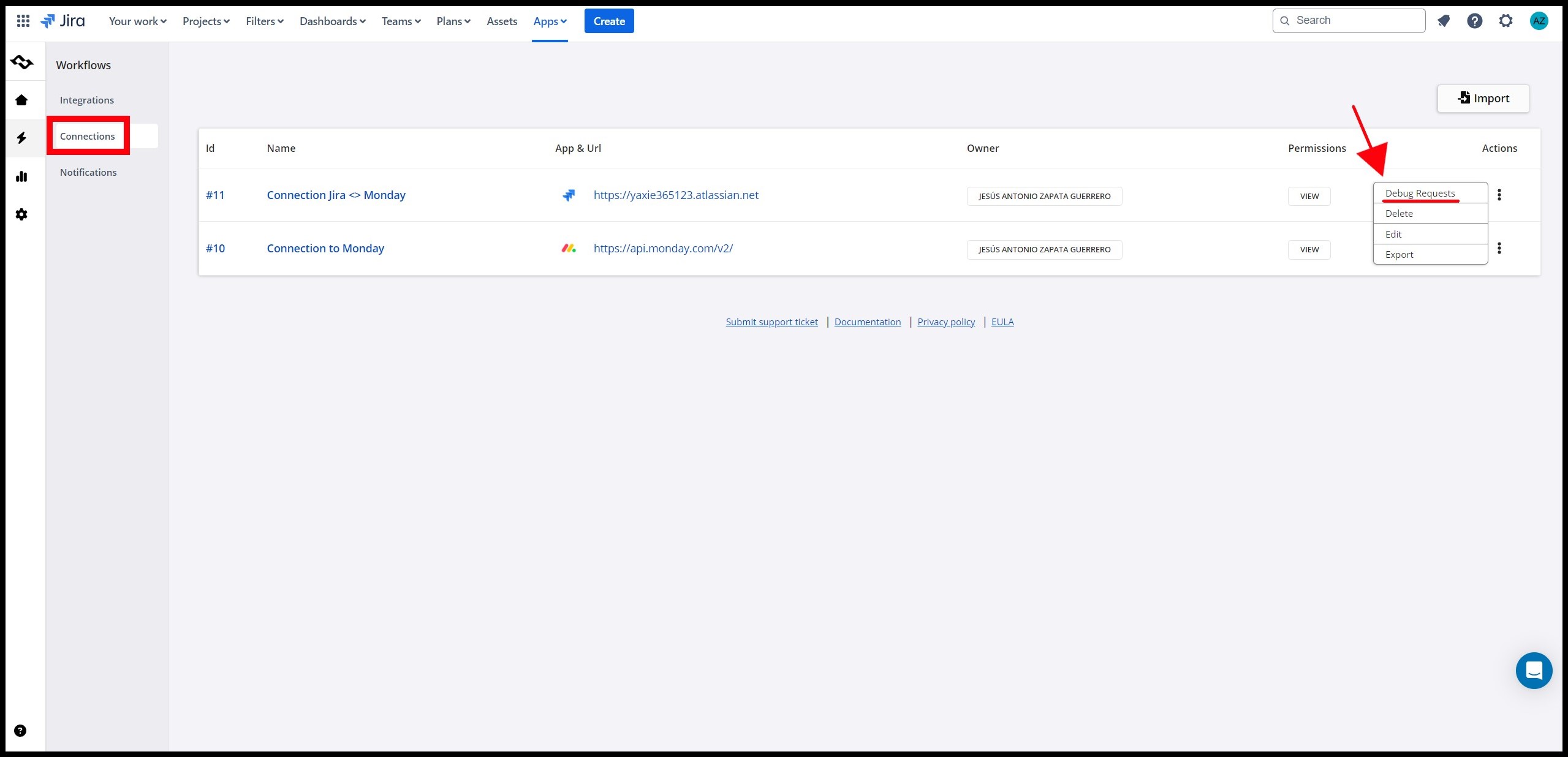 Once you've approved access to Getint, we'll utilize the **Debug requests** option within Connections to download relevant REST API responses and effectively troubleshoot your issue.