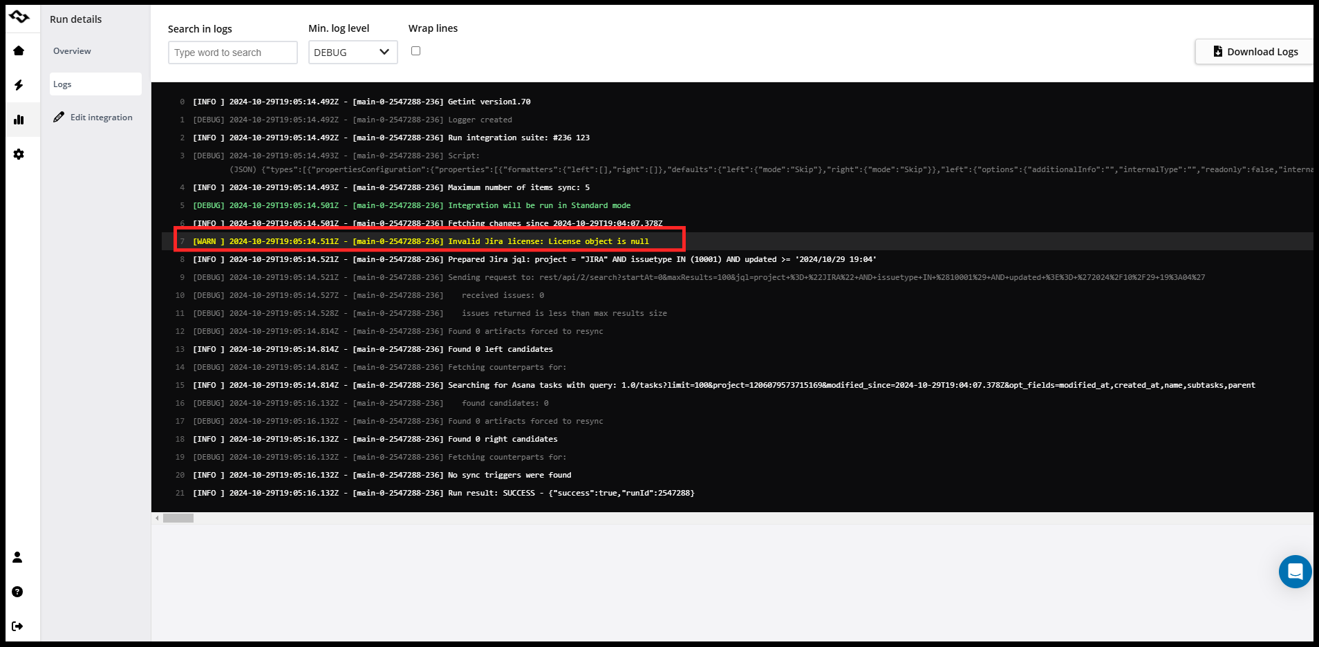 For detailed troubleshooting, review the logs in Getint to identify any license-related errors: