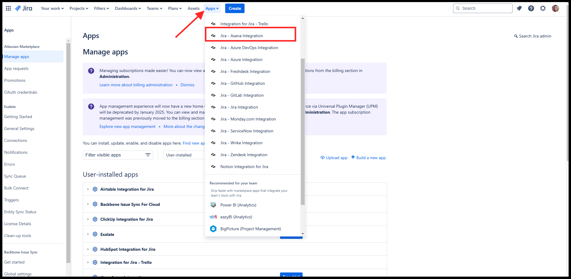 * Select Administration on the appropriate app, like “Jira-Asana” if integrating Jira with Asana.